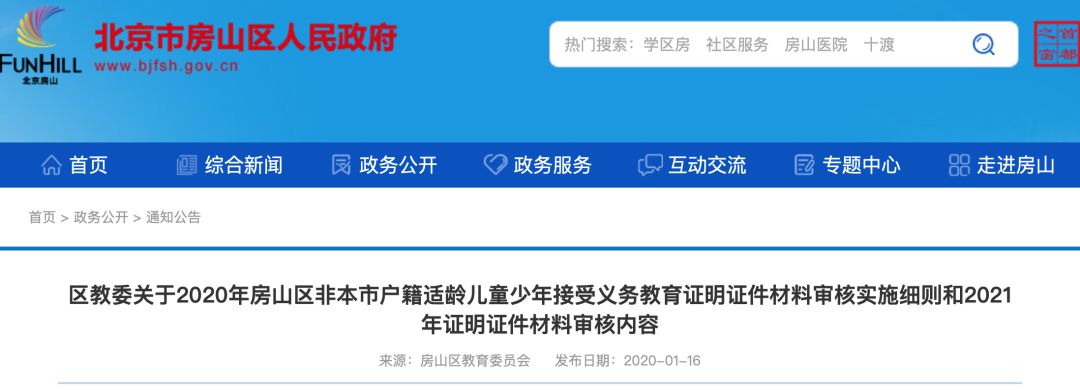 2020年1月16日,房山区区教委率先发布关于2020年房山区非本市户籍适龄儿童少年接受义务教育证明证件材料审核实施细则和2021年证明证件材料审核内容。
